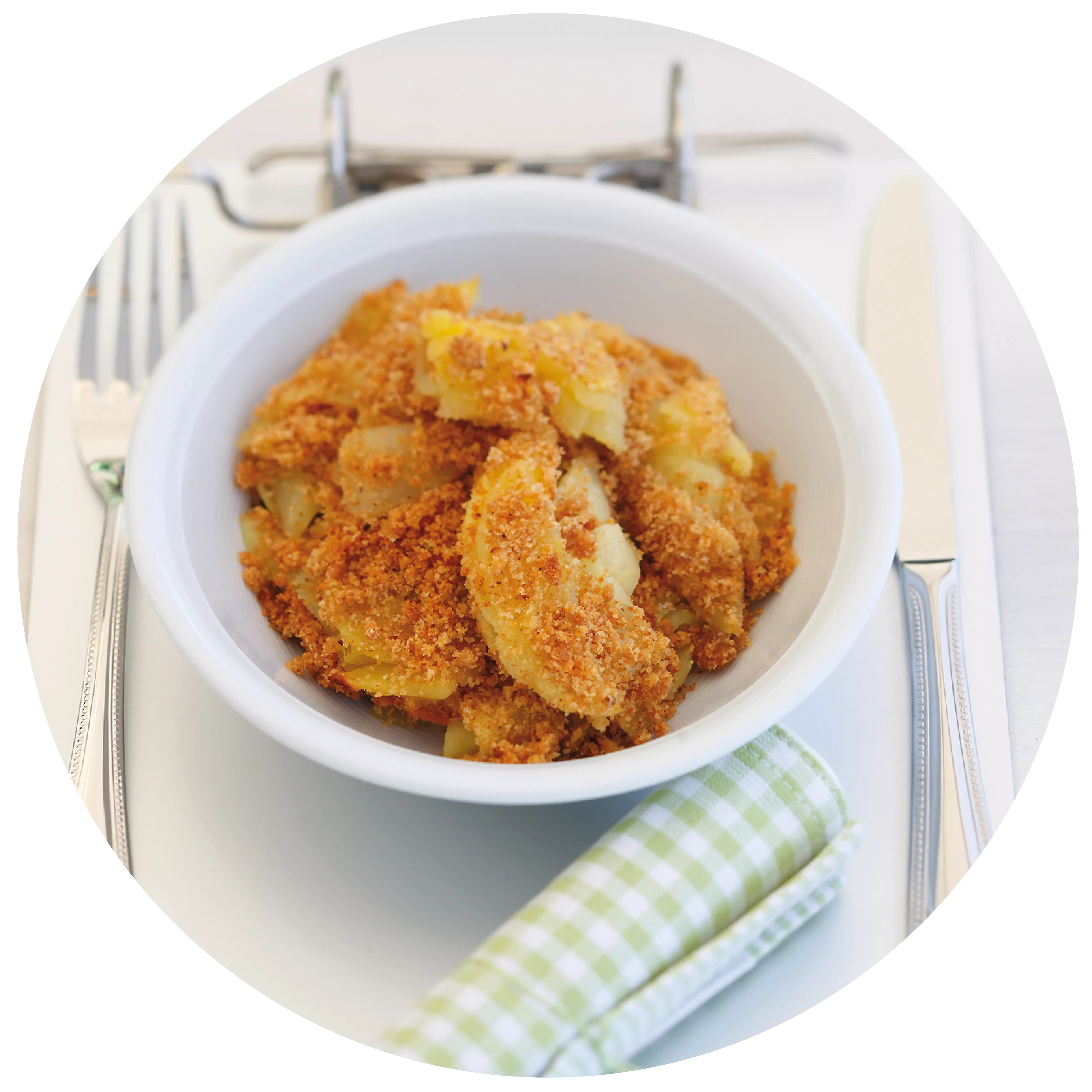 パン粉、バター、スパイス、砂糖大さじ2をフライパンで炒める。リンゴは皮をむいて輪切りにする。ラム酒と砂糖を加えた白ワインで汁気がなくなるまで炒める。